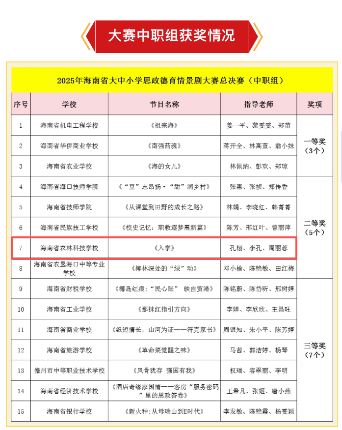 ??2025年海南省大中小学思政德育情景剧大赛总决赛于11月9日落下帷幕。我校师生代表队携原创剧目《入学》征战中职组赛场,在全省多支参赛队伍的激烈角逐中脱颖而出,以真挚动人的舞台演绎荣获二等奖,为学校思政教育工作再添亮眼成绩。?