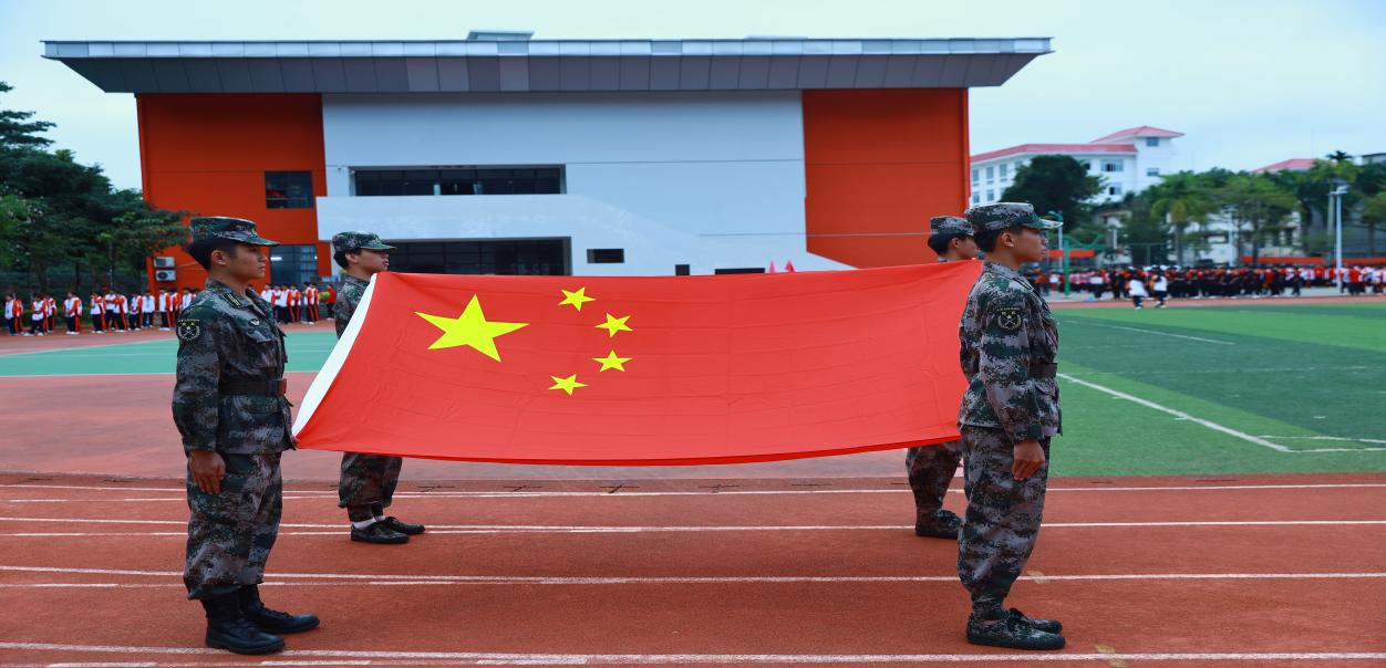 国旗护卫队队列整齐,迈着有力的步伐,护卫着国旗步入升旗台。伴随着雄壮激昂的《义勇军进行曲》,鲜艳的五星红旗冉冉升起。全体师生庄严肃立,奏唱国歌,向国旗行注目礼。