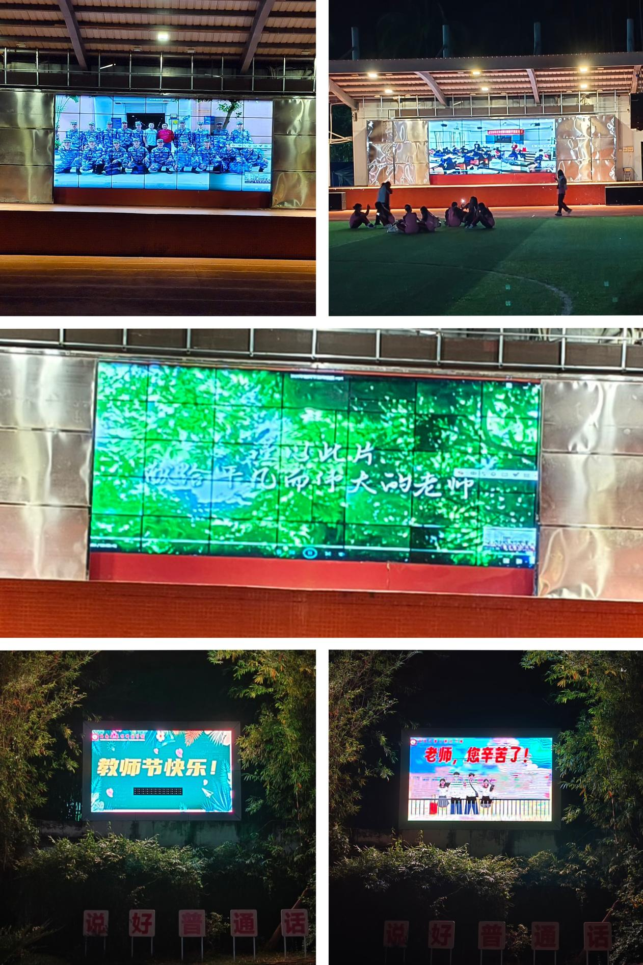 ??活动期间,在学校运动场主席台大屏幕与教学楼广大LED屏幕滚动播放教师风采视频与感恩教师标语,营造出浓厚的尊师重教氛围。