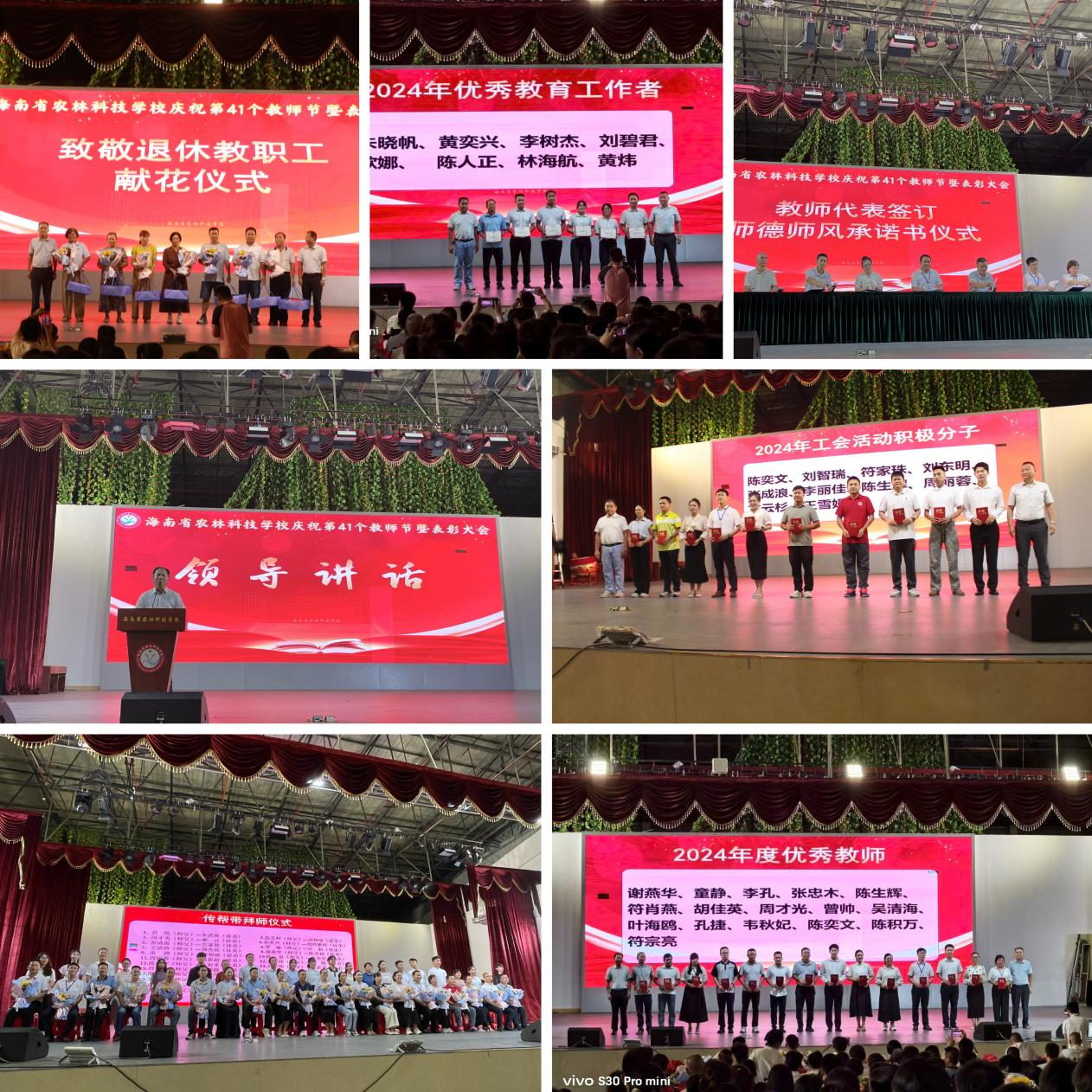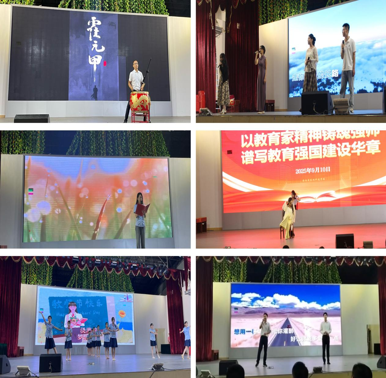 ??9月10日,学校举行了庆祝第41个教师节晚会并取得圆满成功。晚会上,有颁奖表彰、新教师宣誓、教师代表签订师德师风承诺书、师带徒传帮带、给退休教职员工献花等环节,每个环节都饱含深情与敬意。教师们用歌声传递着对教育事业的热爱,学生们则以舞蹈、朗诵等形式表达对老师的敬爱与感激,现场气氛热烈而温馨,掌声与欢呼声此起彼伏。